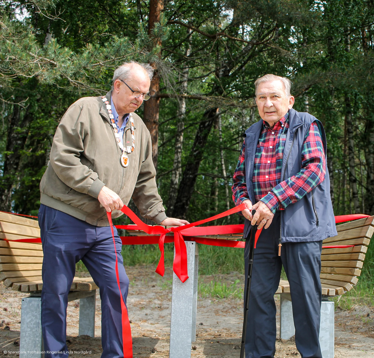 Åpningen ble markert med en høytidelig, og bærekraftig gest: Ordfører Johansen og initiativtaker Hauge lot saksa ligge, og knyttet opp det røde silkebåndet i stedet. Benkene ble erklært åpnet, og silkebåndet lever videre til neste anledning.